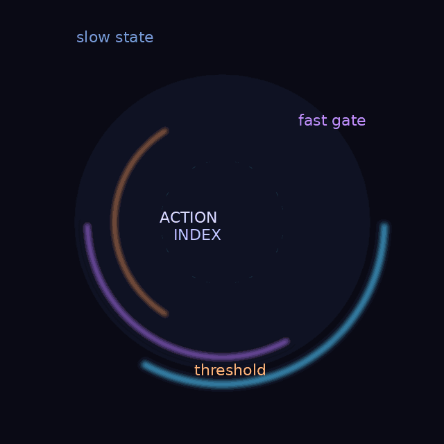 The circle is a dynamical phase variable.Β It captures whether the system is inert, accumulating, absorbing stress, or releasing momentum.Β