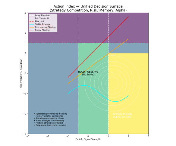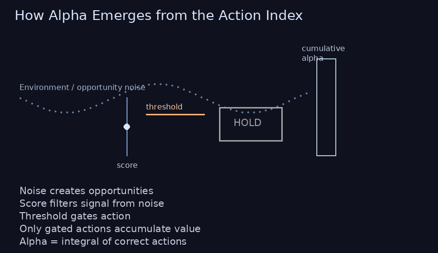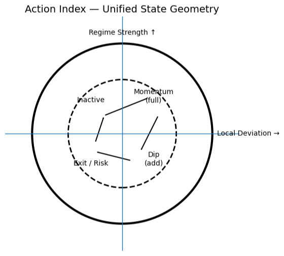 Action Index converts noisy price dynamics into low-dimensional state geometry, where decisions arise from transitions between regime - deviation states rather than forecasts, allowing alpha extraction under uncertainty.Β