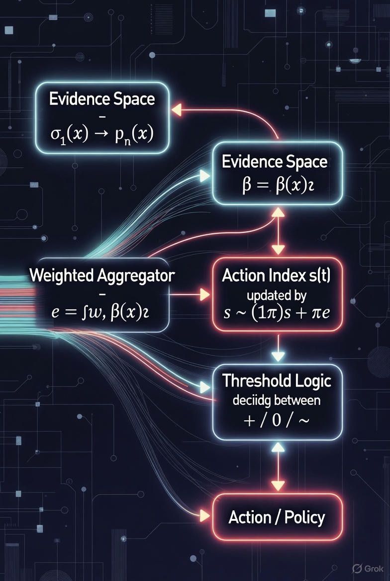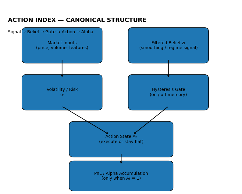 The Action Index is a control-layer abstraction that converts uncertainty into bounded action. It models market state geometrically, tracks belief and volatility dynamically, and uses hysteresis-controlled thresholds to regulate action. Rather than predicting outcomes, it manages exposure by enforcing stability, memory, and momentum constraints. Alpha emerges as the accumulated effect of disciplined action under uncertainty, rather than forecast accuracy. This removes human bias while preserving adaptivity.